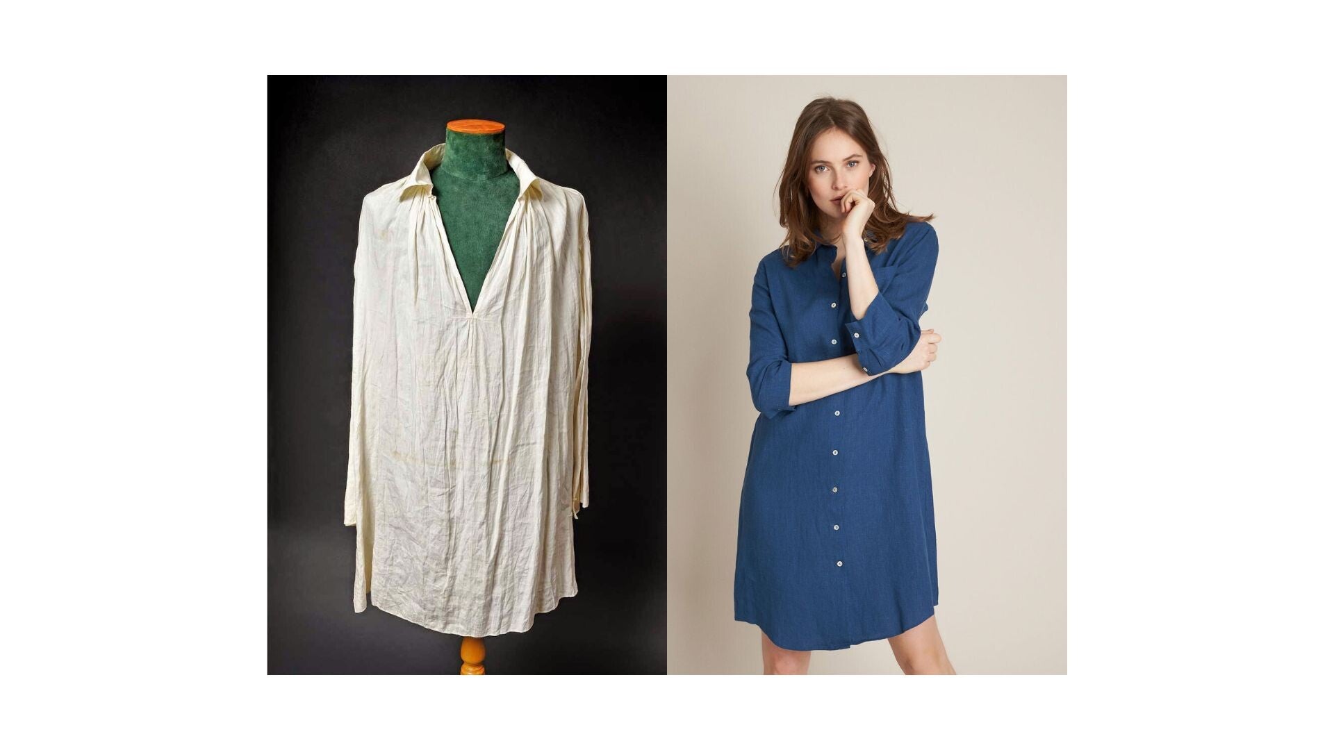 À l’origine, la chemise-robe trouve ses racines dans la chemise traditionnelle, empruntée au vestiaire masculin, dont elle reprend la structure et la simplicité.
