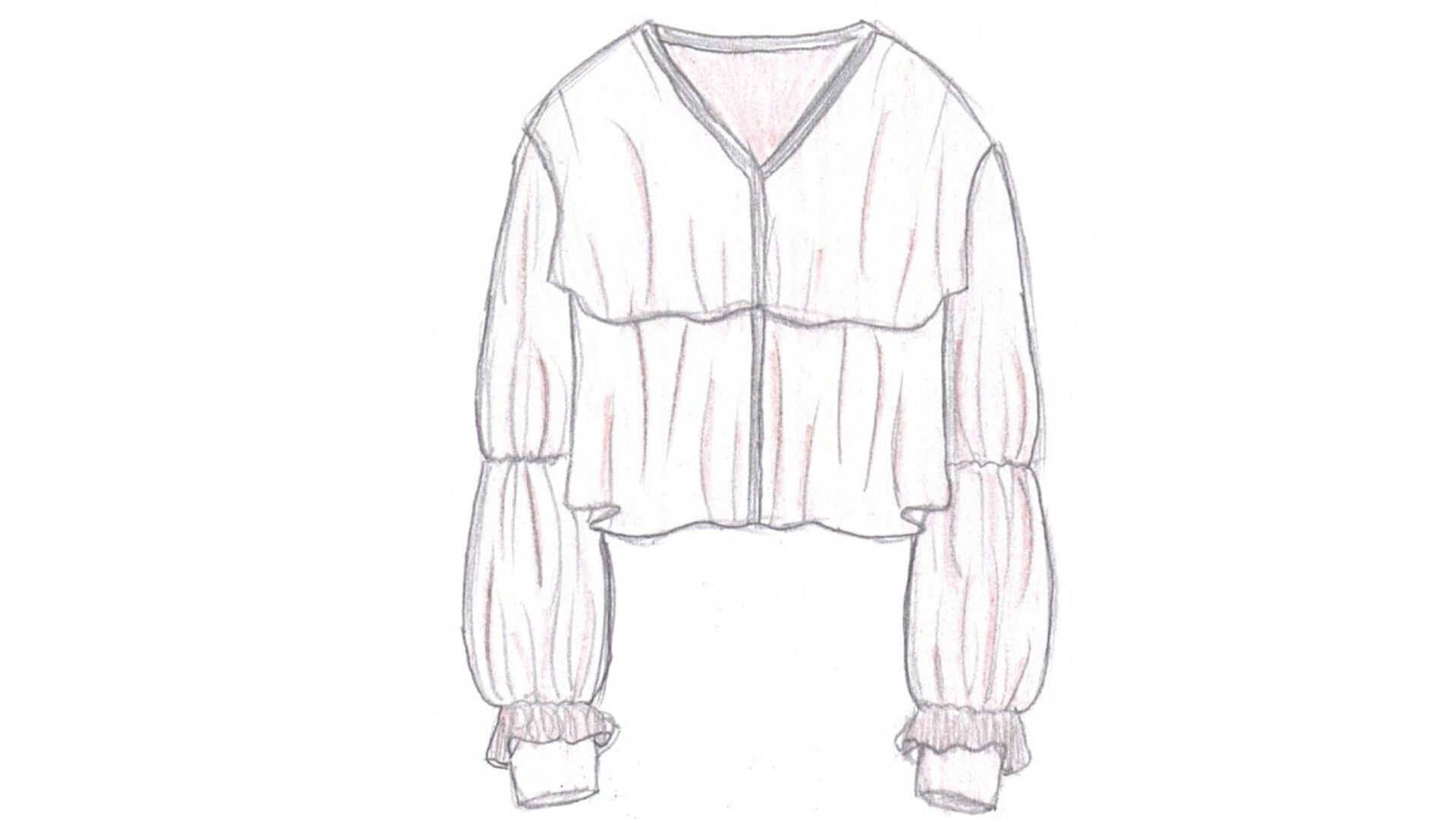 Croquis d’une blouse en matière fluide comme de la mousseline, caractérisée par ses volant et ses fronces au manches.